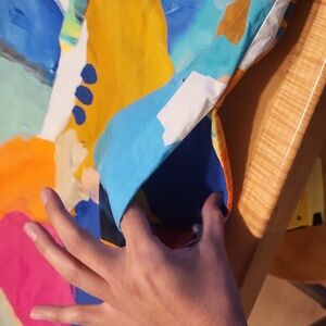 Embrace vibrant style with this colorful abstract print shirt dress. Perfect for making a statement, this dress features a mix of bold colors including blue, pink, and orange. Ideal for any occasion, it combines comfort with a unique design.