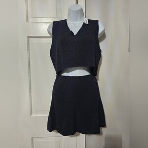 This elegant black knit skirt set offers a chic and comfortable style. Perfect for any occasion, it features a sleeveless top and matching skirt. Elevate your wardrobe with this versatile piece.