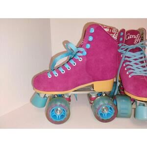 The product is a pair of women's roller derby skates by the brand Candi Girl in a size 5. The skates are in a vibrant berry red raspberry color, designed for outdoor sports and in-line skating. With a focus on style and performance, these roller skates are perfect for women looking to add a pop of color to their skate gear while enjoying the thrill of roller derby or recreational skating. Built for size 5 feet, these skates provide a comfortable and secure fit for a smooth and enjoyable skating experience.