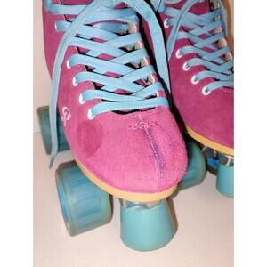 Small stains on laces, stain on right toe, signs of wear on wheels and toe stop. All shown in photos.
