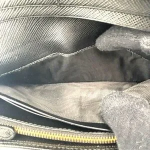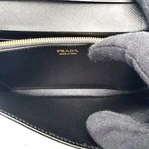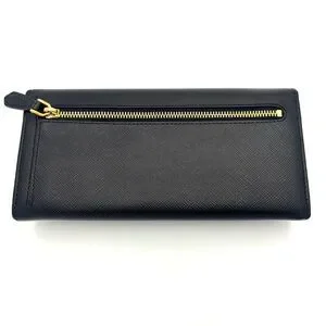 Chic Prada wallet in sleek black leather. Features a gold chain strap and elegant bow accent. Ideal for stylish outings.