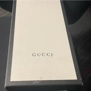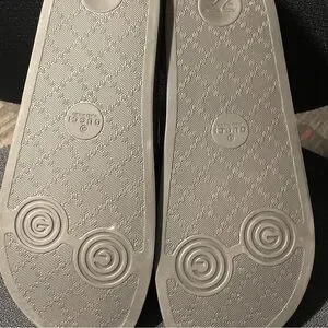 Stylish Gucci slides with a bold gold logo and star pattern on a black base. Ideal for casual wear.