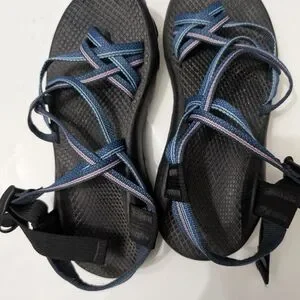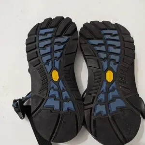 Chaco sandals with black soles and blue strappy design. Perfect for outdoor adventures. Pre-owned and in excellent condition, size W7