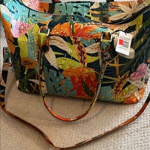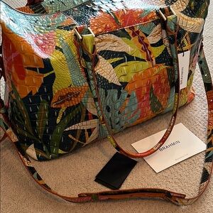 This Brahmin travel bag features a vibrant botanical print in orange and green, perfect for a tropical getaway. Its structured yet casual design makes it ideal for both short trips and extended vacations. Crafted with textured fabric and brown leather handles, it combines style and functionality effortlessly.