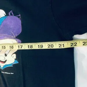 This is a vintage t shirt from 1990's. It is black super heavy weight preshrunk, 100% Cotton with short sleeves and a crew neck. It shows the Looney Tune Gang - Bugs Bunny Taz Martin the Martian Elmer Fudd Wile E Coyote Roadrunner -