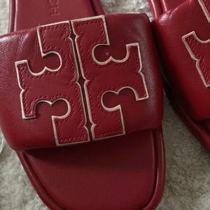 Step out in style with these chic Tory Burch red slide sandals. Perfect for casual outings, these sandals offer both comfort and elegance.
