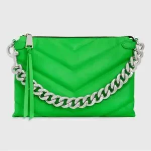 The chevron quilted finish adds interest to this chic crossbody bag crafted of smooth neon green leather. It is styled with a chunky silver chain top handle and a removable adjustable crossbody strap for versatile styling.