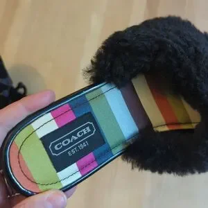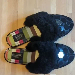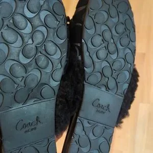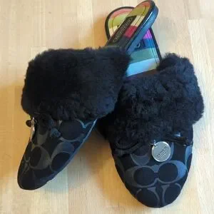 Coach Designer Carra Black Faux Fur Slip-On Slipper Shoes W/ Logo Charm Luxe