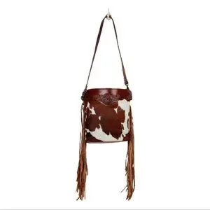 This Genuine Leather Myra Bag crossbody features a striking Hair~On brown and white cowhide pattern on Both Sides, complemented by decorative genuine leather fringe tassels. Its Adjustable Hand~Tooled Genuine Leather shoulder strap and Hand~Tooled detailing across the top adds to its western-inspired charm. It’s definitely a standout accessory for any occasion, & western style enthusiast. Very Clean inside & Out. Zipper Top. Gently Pre~Loved.