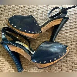 Omg these are amazing! No size tag but I’m a size 7.5 and they fit so anyone 7-7.5 they’re probably fit! Leather and wood! Studs around front leather. Sling back style. Used MADE IN THE USA.