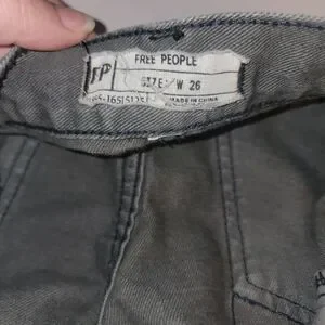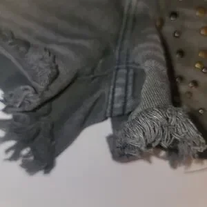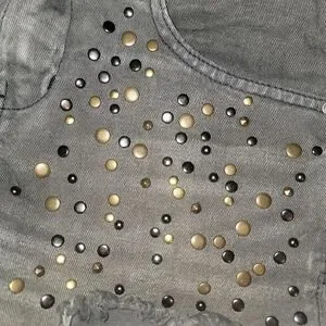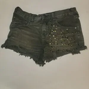 Free People shorts size 26. Black with bronzish gold studs. Distressed. Style is Hippie Studded Shorts in Stone Black wash. Waist flat 14.75" across the top, rise 8.75", inseam 3", leg opening 10.5" flat at hem. Good used condition. Stock photo is for fit reference