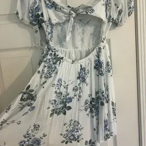 Chic mini dress with blue floral pattern. Features puff sleeves and smocked waist. Perfect for casual outings.