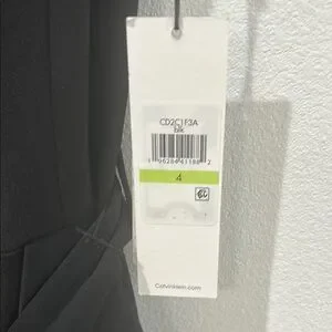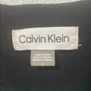 This striking black dress by Calvin Klein features an asymmetrical ruffled design, perfect for a night out. The sleeveless sheath silhouette is complemented by a V-neckline, offering a chic and modern look. Ideal for cocktail events, this dress combines elegance with a touch of contemporary flair.