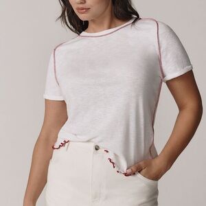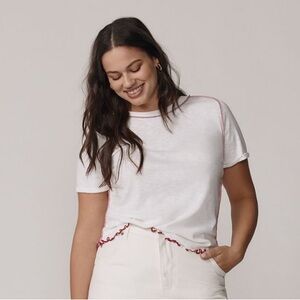 Elevate your casual wardrobe with this brand new cream-colored fitted raglan t-shirt from Pilcro for Anthropologie. Featuring short ruffled sleeves and classic raglan styling. Perfect for any casual outing, it offers a chic and stylish look.