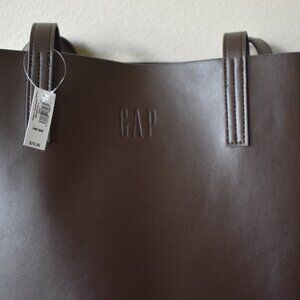New with tags. Gap brand tote bag in dark brown. Shell is synthetic leather, lining is polyester. It has one small internal back pocket.