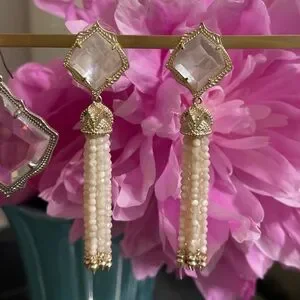 Classic timeless elegant chic bling glitz glam glamor wedding bride bridal country western fringe tassel coastal cowgirl gems sparkly beaded chandelier drop drops dangly earrings Kendra Scott signed pool party festive festival whimsy beach seaside nautical summer pretty femme feminine coquette cottagecore tropical vacation resort cruise whimsy shabby chic