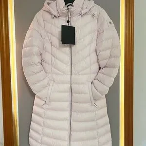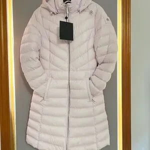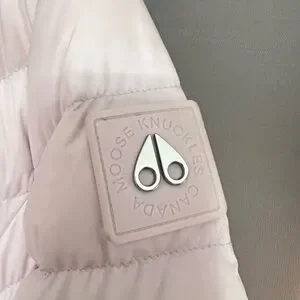 Experience warmth and elegance with the Moose Knuckles lilac Puffer Jacket, featuring a sleek quilted design and a cozy hood. This knee-length coat combines functionality with a feminine touch, perfect for cold weather.