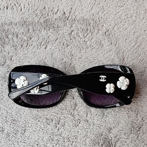 Stylish CHANEL sunglasses with a sleek black frame. Features elegant purple lenses. Perfect for a sophisticated look.