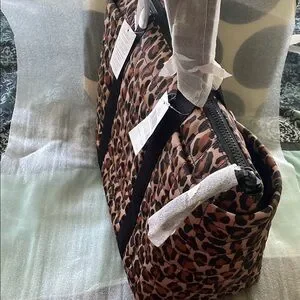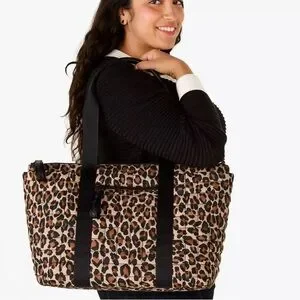 This chic tote from Kate Spade features a bold leopard print in brown and black, complemented by sturdy black straps. Its spacious design makes it perfect for shopping or travel, offering both style and practicality.
