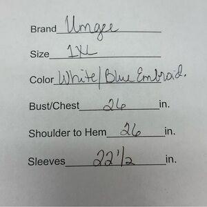 Breezy and boho-chic, this Umgee USA peasant-style blouse in size 1XL features beautiful blue embroidered geometric patterns on a crinkled white fabric. Designed with 3/4 sleeves, a flowy silhouette, and a tasseled tie neckline, it's ideal for spring festivals, summer vacations, or resort-inspired casual wear.