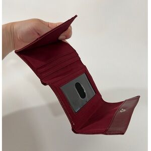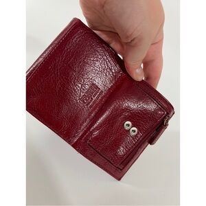 Gorgeous red leather billfold in excellent condition. It has a big billfold area, zip pocket, card slots, and clear slot for ID.