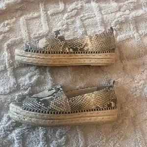 These DKNY espadrilles feature a chic cream and grayish green color palette, perfect for casual summer outings. The slip-on design with a wide strap offers ease and comfort, while the braided jute sole adds a touch of traditional style. Enjoy the slight platform heel for a subtle lift and a versatile look that pairs well with any outfit.