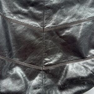 This Hobo black leather shoulder bag is perfect for any occasion. Its practical design and high-quality leather make it a must-have accessory. Side zip pocket, back slip phone pocket. Interior one zip pocket and three slip pockets. Print fabric interior. Brushed brass hardware. Some almost imperceptible light scuffing on bottom of bag (see last photo). Size 11.5”H, 14”W.