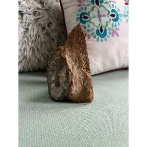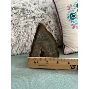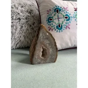 This is a natural agate geode, new without tags or box. The exterior is rough and brown, while the interior reveals a crystalline cavity. The cut face displays concentric bands of gray and white. It is approximately 4.5 inches tall and 3 inches wide. There are no visible chips or cracks on the polished face. The item is stable and sits upright.