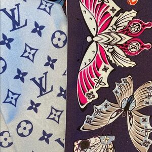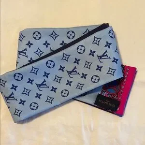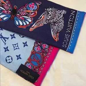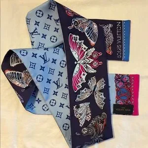 This exquisite Louis Vuitton scarf showcases a harmonious blend of blue and pink hues, adorned with the iconic monogram pattern and butterflies. Crafted from luxurious silk, made in italy, it offers a sophisticated touch to any ensemble to wear on handbag or neck or hair. The vibrant colors and classic design make it a standout accessory for any occasion. 3.25” x 48” Pattern no longer available.