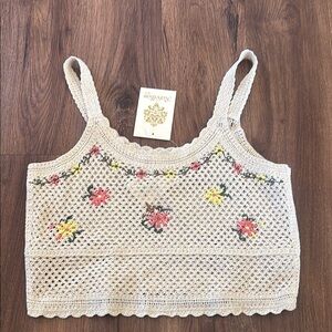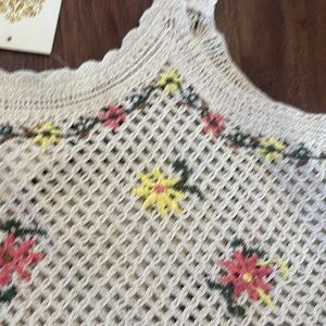 Elegant crochet tank top with colorful floral embroidery. Ideal for a casual yet stylish look.
