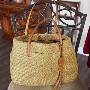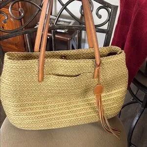 Eric Javits Woven bag with leather handles and tassel.