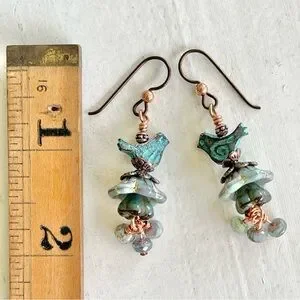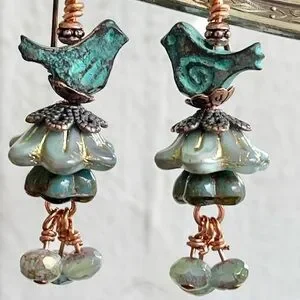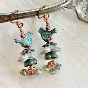 These limited edition earrings feature Czech glass flower bells and faceted rondelles in and shades of blue and teal. Perched birds sing a sweet song.