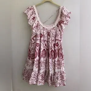 Chic mini dress with intricate red patterns. Features ruffled sleeves and a flowy silhouette. Perfect for casual outings.