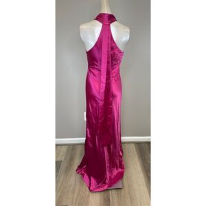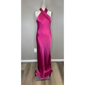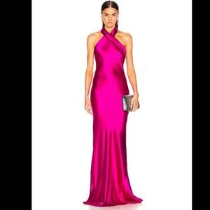 Hourglass heavy silk satin gown with a cascading back halter sash