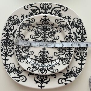 Enhance your dining experience with this elegant black and white dinner plate set. Two salad plates approx. 7” diameter, one dinner plate approx. 10” across. Perfect for any occasion, these plates add a touch of sophistication to your table setting. No damage, I’ve had these for years and never used them.
