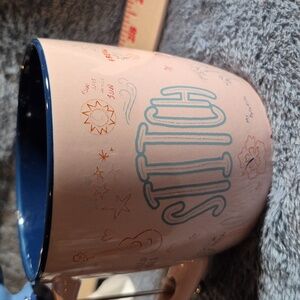 Adorable pink mug featuring Stitch with a matching figurine stirrer on the handle. Perfect for fans.