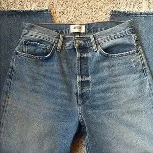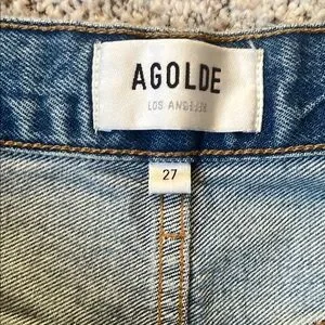 These Agolde jeans feature a stylish cropped ankle design in a classic blue hue. The vintage wash adds a touch of timeless appeal, making them perfect for casual outings. Crafted with quality denim, they offer both comfort and a chic, modern look.