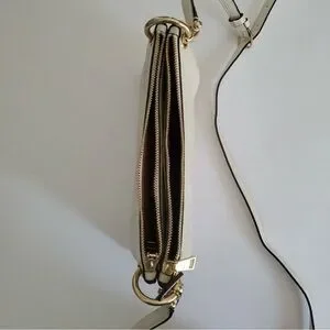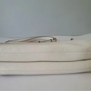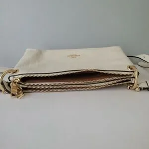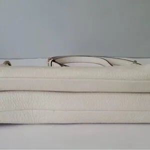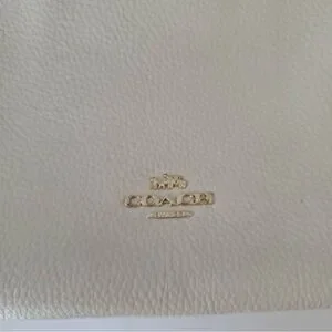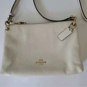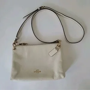 White pebbled leather crossbody zip top purse from Coach. Double sided with a space in between. Clean on the inside with multiple pockets. Gold hardware. Very light wear to the bottom corners of bag, excellent condition, no marks! Ton of room, yet sleek and light. Small mark on the strap from sizing.