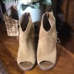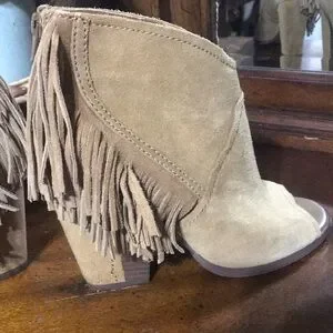 Elevate your style with these Gianni Bini ankle booties, crafted in a chic tan hue. Featuring a bohemian fringe detail around the ankle, these boots offer a casual yet stylish look. The suede material and side zipper closure ensure both comfort and ease of wear.
