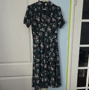 Unique Vintage Dark Green Floral Midi Dress