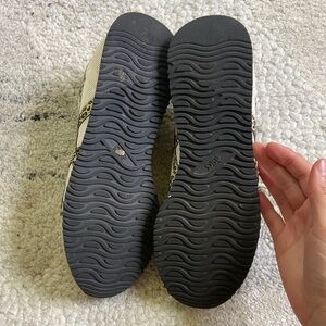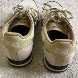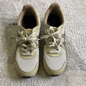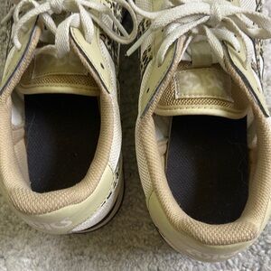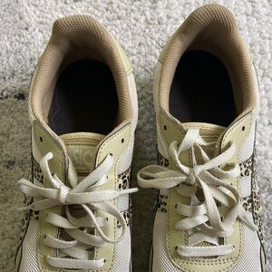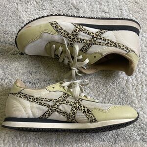 These Asics sneakers combine a classic retro design with a modern twist, featuring a cream and tan color palette. The upper is crafted from a blend of mesh and leather/synthetic materials, highlighted by distinctive leopard print side stripes. Perfect for those seeking a blend of vintage style and contemporary flair.