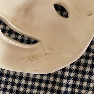 Set of ceramic masks featuring comedy and tragedy expressions. Made in USA by Cast of Thousands. Sold as a set. See photos of repair made to comedy mask. Measure 4 1/2 inches across. 5 1/2 inches tall.