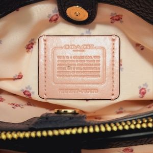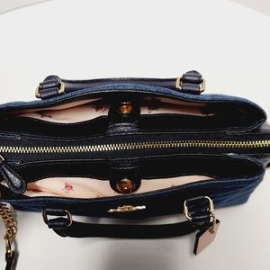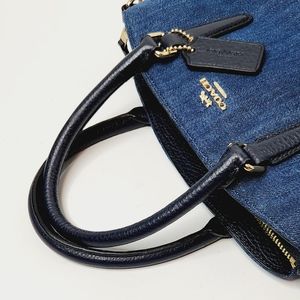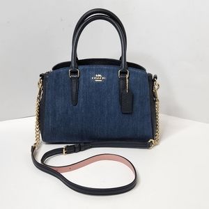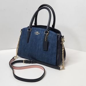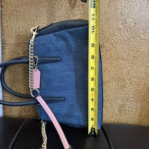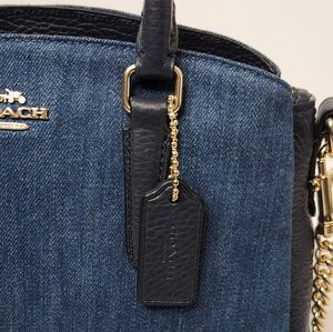 Stylish Coach crossbody bag. Features blue denim and black leather. Gold chain accents. Perfect for any occasion.