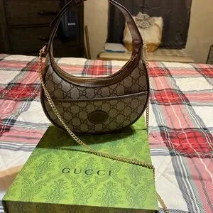 This luxurious GG mini moon shoulder bag features the iconic GG monogram pattern in a rich brown canvas, complemented by elegant gold-tone hardware. Its structured design and premium craftsmanship make it a timeless accessory for any sophisticated wardrobe. In excellent used condition. Comes with box and dust bag and shopping bag.Approximately 8.5x4.3x2 Very beautiful bag at a super low price!