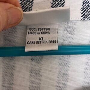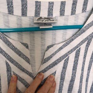 So flattering with the vertical stripes of Navy on white. Wild Palm, sold at Blue Ginger stores in Hawaii, upscale boutique. Size xl, pit to pit 22.5, 15" sleeve, 27.5 shoulder seam to bottom hem. Classic style looks great with jeans, white or navy pants.