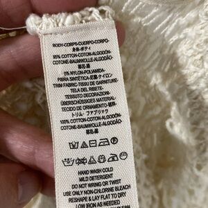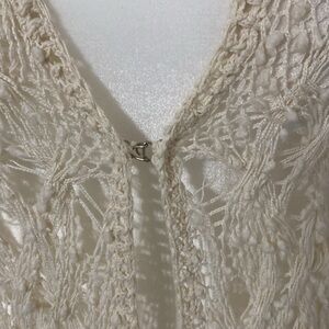 Lacy open weave ivory crochet vest. Features fringe accents. Hook closure. Good. Great boho layering piece in good condition. From the brand Free People. Please ask any additional questions.
