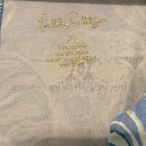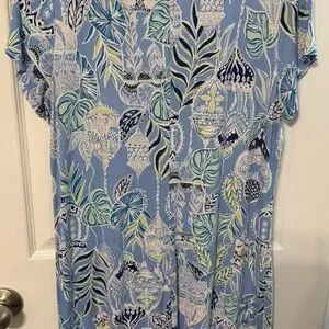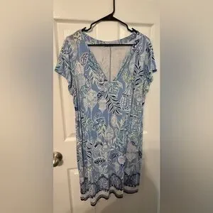 Elegant dress with a vibrant blue and white pattern. Features a chic design.