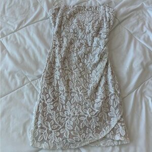 This elegant cream sheath dress by Windsor is designed for special occasions like weddings. It features a strapless neckline and a sleek, form-fitting silhouette that exudes sophistication. The intricate lace overlay adds a luxurious touch, making it a standout choice for brides and wedding guests alike.