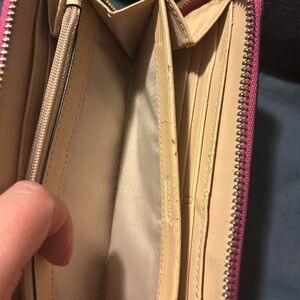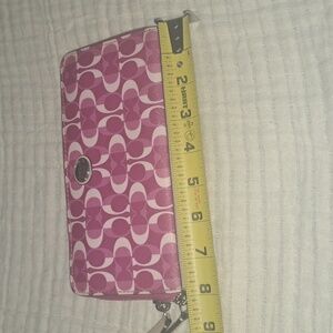 Stylish Coach wallet. Pink pattern with cream accents. Secure zip closure. Iconic logo detail.