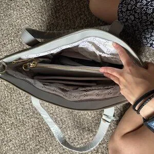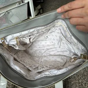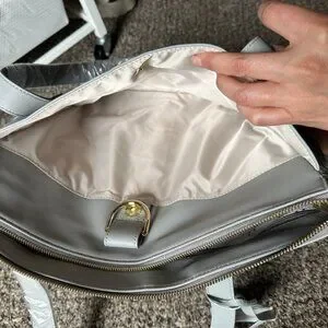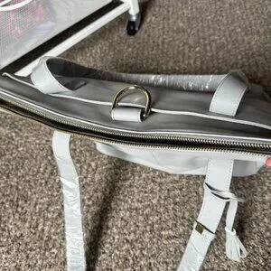 Bought this in a sale last spring, have not used it. Maybe took it out to look at it like 5 times. The company just closed. everything in there is new- straps for the detachable purse and the dust bag. The inside lining can be removed to be washed. It is in the stone color